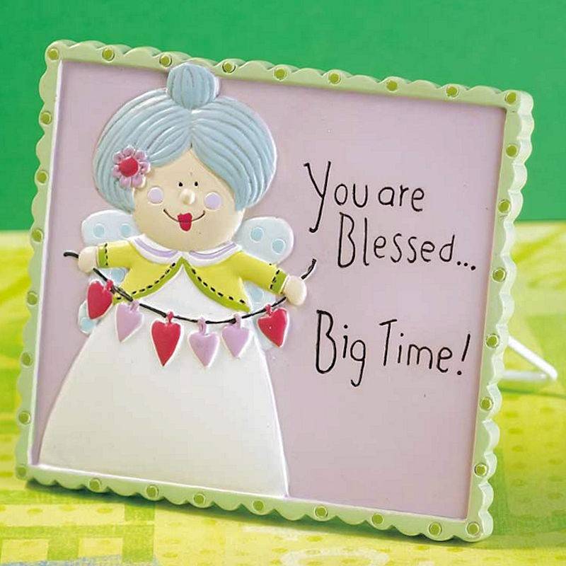 Our 911 angel fantasy art plaques have simply adorable sayings and inspirational messages. Designed by Jozie B, these angel plaques include their own metal display stand. This Blessed Big Time plaque features an adorable grey haired angel holding a garland of hearts and the words say,You Are Blessed, Big Time!