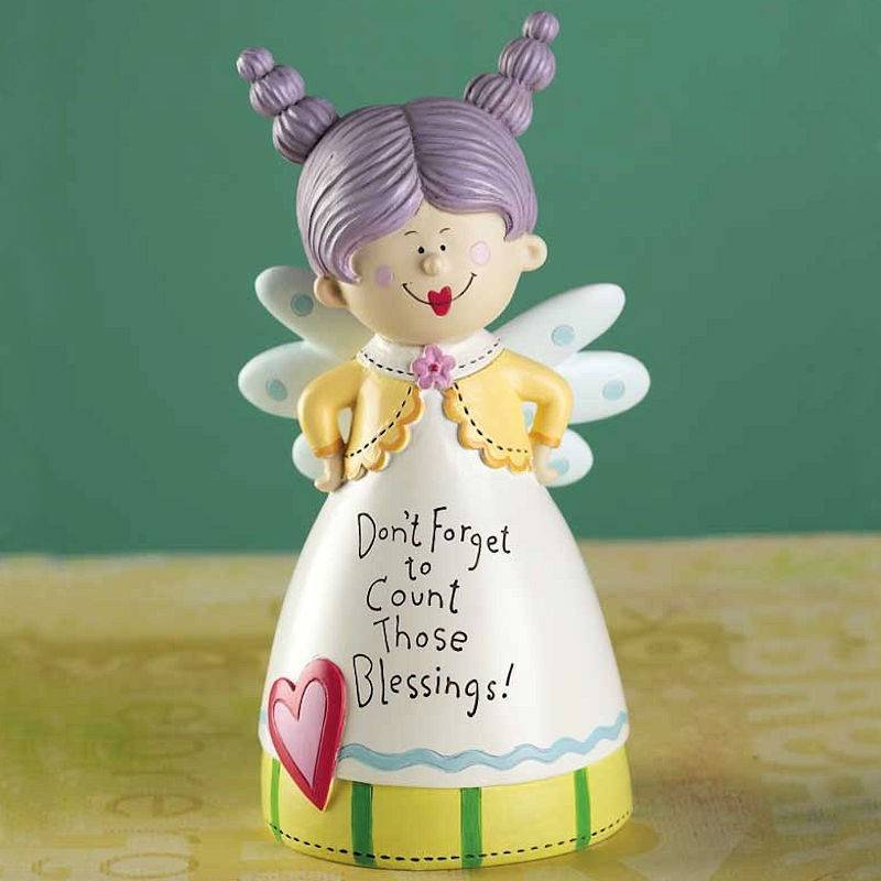 Searching for the right words to inspire encouragement? Our 911 angel figurines can come to the rescue! Designed by Jozie B, these delightful resin fantasy art angel figurines will make you smile. Bright colors with a variety of funny hair dos, each figurine shares a bit of wise inspiration. Our Count Your Blessings angel figurine features a purple hair angel with two spiky ponytails, an orange sweater, white dress with colorful yellow and green trim, a big red heart and says, Do not Forget to Count Those Blessings!