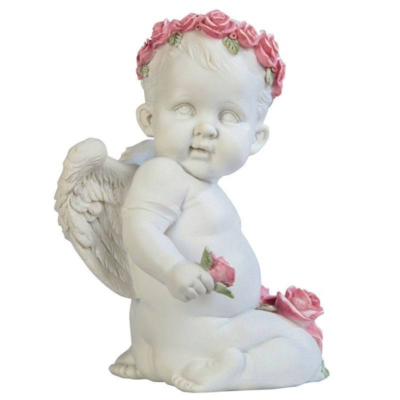 Measuring 7 inches tall, the baby angel is kneeling on the ground.