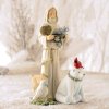 This dramatically gorgeous Christmas angel figurine features an unusual design. A glittering white arbor made from the trees in a winter forest frame the angel. Delightful cardinals surround her and one sits on her left hand. A green garland crowns her lovely blonde hair and her white feather wings are spread behind her. The beautiful Christmas figurine from the Grasslands Road Winter Wilderness collection is wearing a flowing white gown and standing upon a stony slab that has the word, Peace