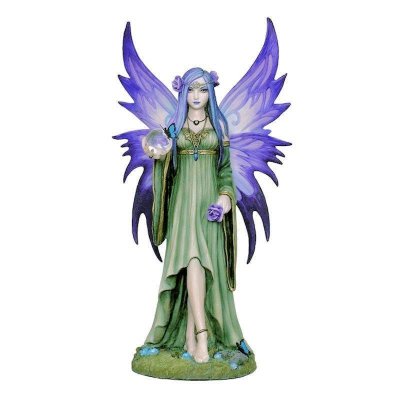 An exquisitely enchanting fantasy art fairy figurine, Mystic Aura comes from the amazing imagination of artist, Anne Stokes. The beautiful enchantress has large purple wings unfurled behind her with filigree designs. A twisted vine crown sits upon her beautiful head with purple roses and a charm with a mysterious symbol at her forehead. Her delicate features are perfectly framed by her long, straight purple hair and her voluptuous lips are a matching purple. A short necklace graces her throat with another long necklace that features an enchanted crystal dangling at her bodice. Her charming empire waist dress is grey with an interesting gold lace design at the bodice and matching lace trim at the edges of the off the shoulder long draping sleeves. A magical crystal ball is in her right hand and she holds a purple rose in the other. A golden ankle bracelet encompasses her right ankle and there are blue flowers on the ground at her feet. A beautiful blue butterfly rests on the crystal ball.