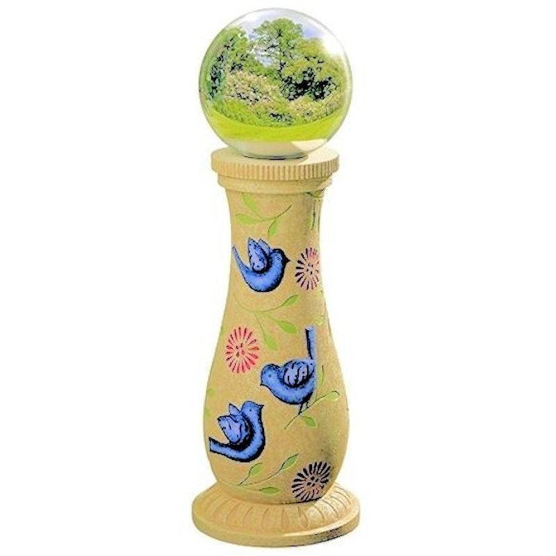 Our amazing silver gazing ball, on its beautiful concrete pedestal stand, is a garden figurine for the exceptional gardener that is searching for a center piece in their garden. The glass gazing ball will reflect all the colors of the blooms in your garden. The pedestal stand holds the gazing ball and features delightful blue bird pictures, red flowers and green leaf accents.