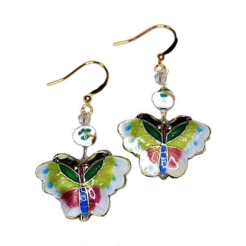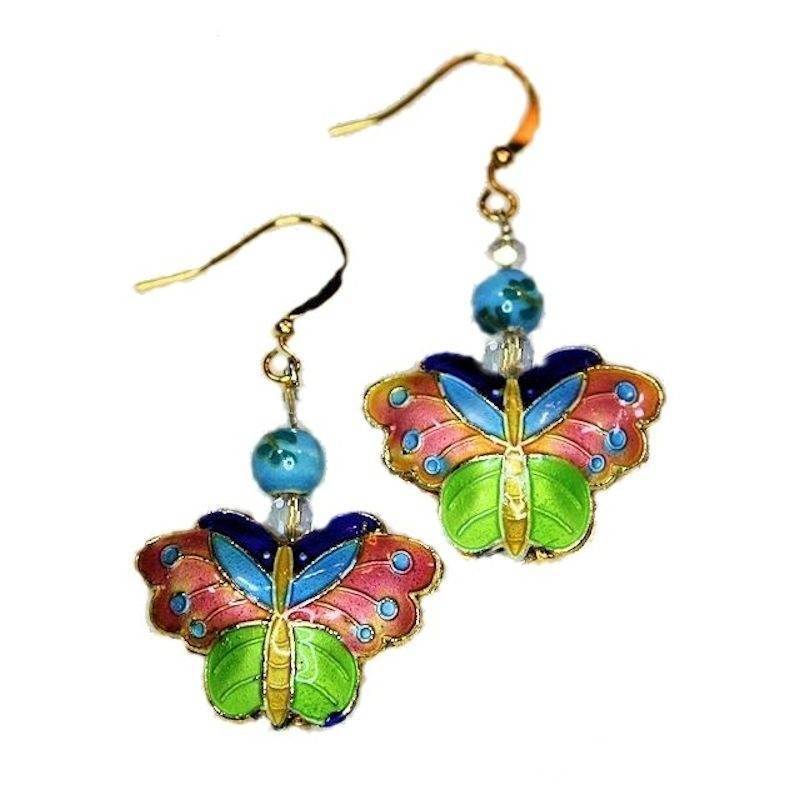 These beautifully charming beaded butterfly earrings have just the right amount of brilliant sparkle from the crystal beads and will make a perfect gift for any woman that loves jewelry. Featuring a colorful cloisonne butterfly shape bead and matching crystal beads, for glitter, the French earring wires are nickel free.
