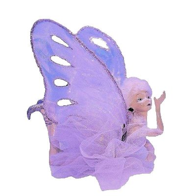 Our adorable fairy figurine, named Purple Kiss, is part resin with a real tulle fabric dress and netted wings from Katherine's Collectibles. She is lays on her belly with her legs folded behind her as she blows you a magical fairy kiss. Her costume features a sparkling purple ballerina style costume with matching glittering ballerina shoes and an off white beaded pearl belt. There are lovely blue flowers in her white fuzzy hair and her purple fairy wings are elegantly beautiful with their sparkling silver glitter edges.