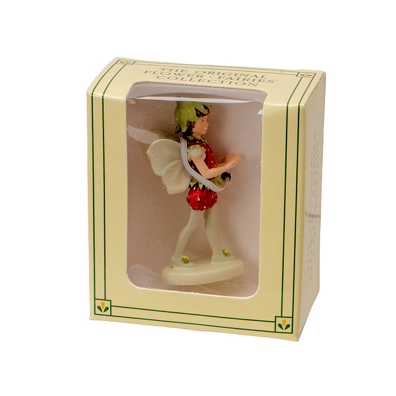 Strawberry flower fairy mini figurine by Cicely Mary Barker measures 2.25 inches tall, 1 inch wide and 1 inch from front to back.