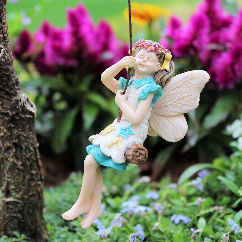 This Kelsey fairy garden figurine measures 3.25 inches tall and 1.5 inches wide and can be hung from a miniature tree, stump or flower stem.