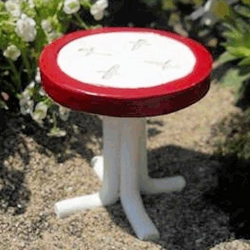 This enchanting red retro fairy garden table figurine measures 1.75 inches tall and 1.75 inches wide.