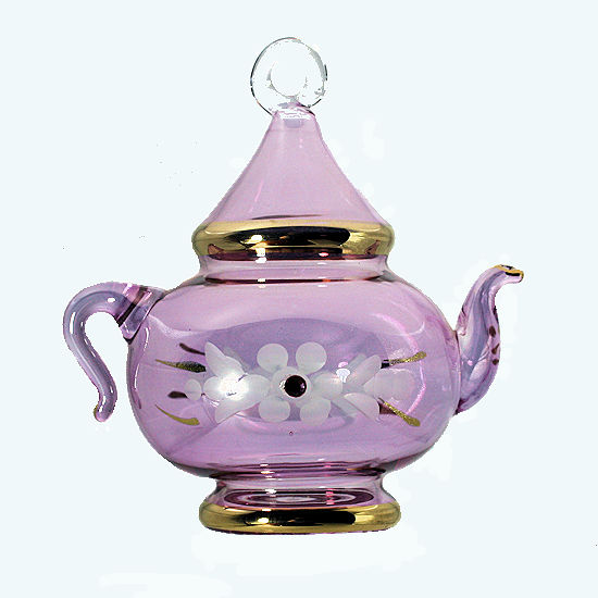 There is an etched glass flower design at the center of this purple teapot ornament from Egypt that has been created by Egyptian Museum. Use this teapot figurine as a Christmas ornament, hang in front of any window or add to a wind chime. A gift box with hangtag is included. Also decorated with 24 karat gold accents, this teapot ornament has been fired in a special oven to bake in the magnificent color.