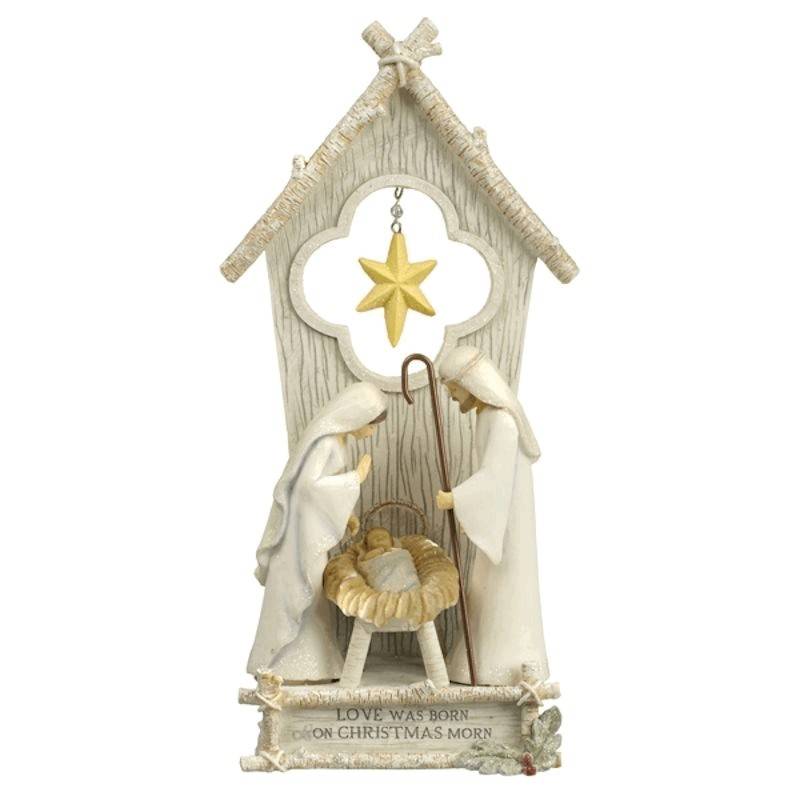 This superbly beautiful Love was Born Nativity Christmas figurine, from the Gifts of Glory collection, features Joseph, Mary and little baby Jesus lying in a hay filled manger. The star of Bethlehem dangles overhead as the proud couple adore their newborn child. At the bottom of this gorgeous Christmas figurine it says, Love was born on Christmas morn