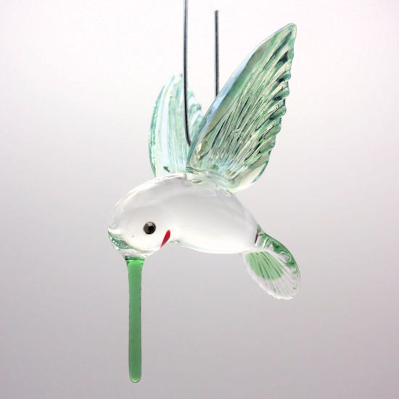 Our fabulous handmade glass hummingbird ornament measures 2 inches tall and 3 inches wide. This delightful hummingbird is offered in pink or green luster colors.