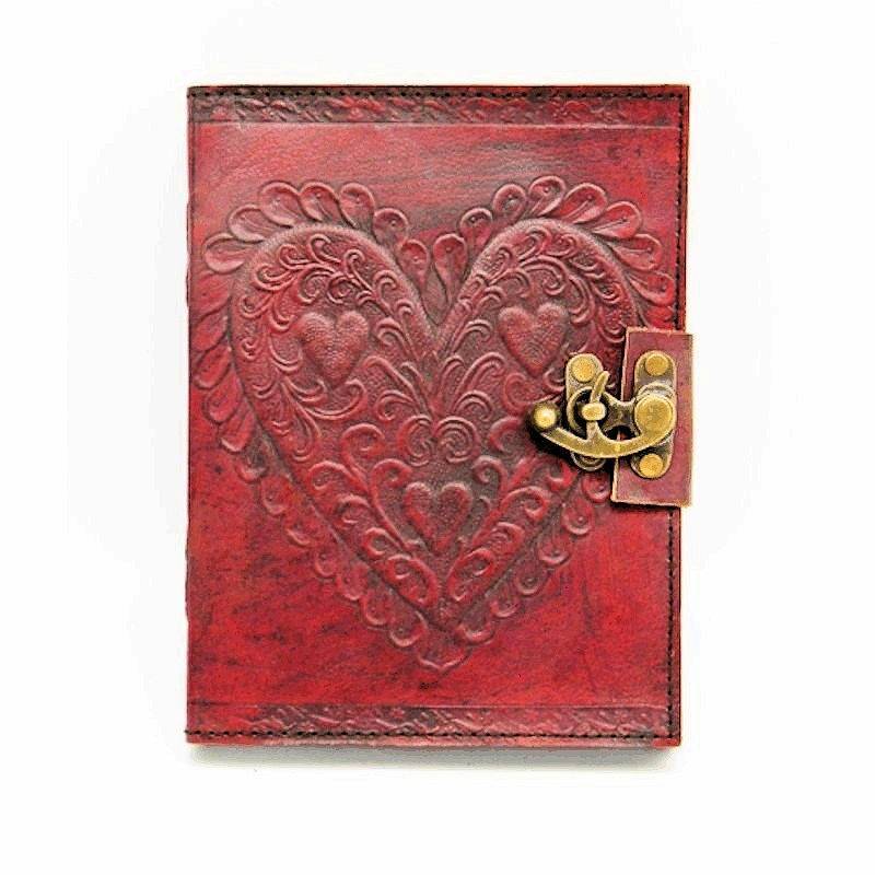 This Embossed Heart design handmade leather journal measures 8 inches tall and 6 inches wide.