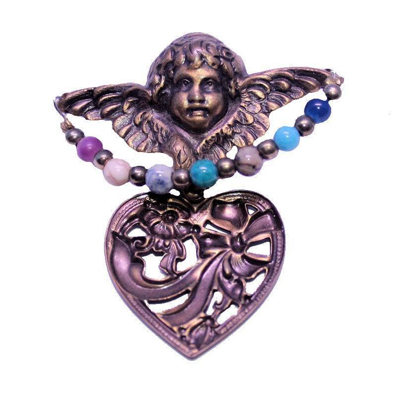 Lapel pins are a great fashion accessory and, if you love angels, this angel lapel pin is perfect for you. This enchanting angel figurine features a heart charm and both the angel and heart are filigree antique gold color. There is a colorful beaded garland with gold, purple, white, light blue, teal and dark blue beads across the front of the pin.