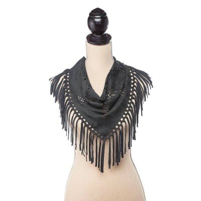 Our fabulous black bandanna style neck scarf features cut-out designs, fringe around the bottom and snaps closed at the back of your neck.