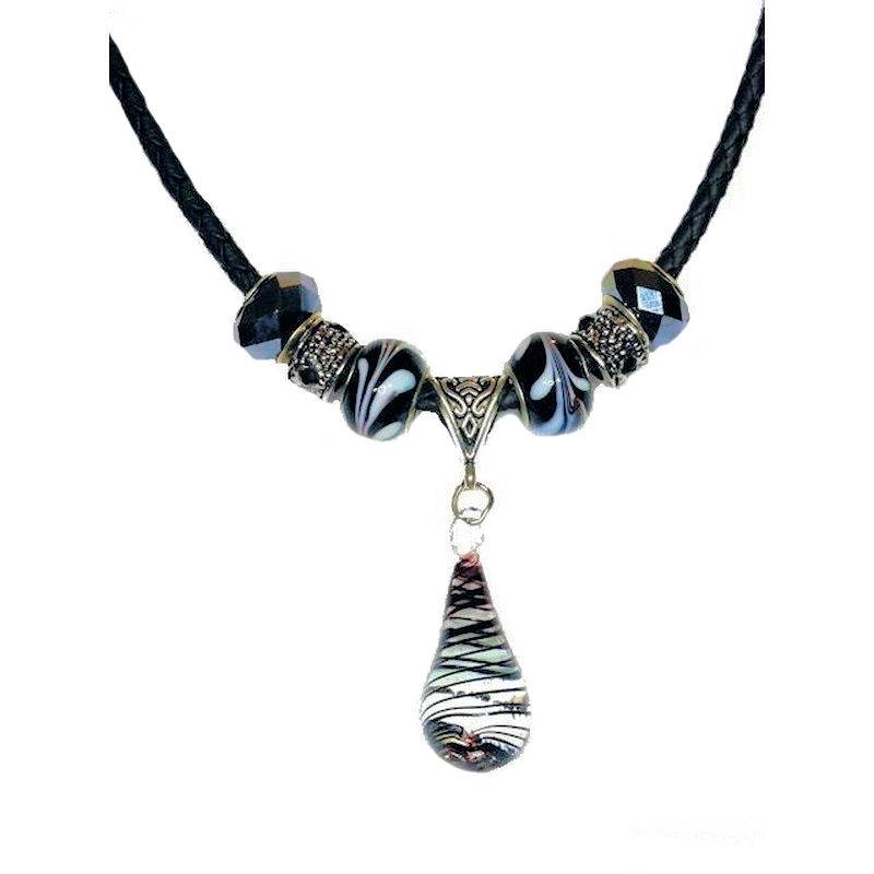 The swirled black pattern on the glass tear drop charm from our Black Sorceress beaded necklace is perfectly accented by the two black and white .925 swirled Murano glass beads, two glittering rhinestone beads and two sparkling faceted crystal beads.