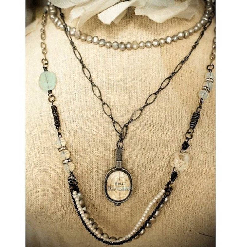 The shortest chain is a row of genuine Mother of Pearl gemstones. The second strand is large links in silver with a glass jewel charm pendant dangling from its center. The glass charm can be opened and a picture inserted or it comes with a design of a French flower and the French word for flower printed on it. The third strand or longest chain features rows of glittering crystals, a sparkling glass crystal and a triple row of seed beads, white pearl beads and more genuine Mother of Pearl gemstones. You will love the way this necklace adds visual interest to everything you wear and makes you look fabulously stunning too.