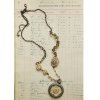 Our extraordinarily beautiful Lace Vintage Heirloom pendant necklace looks like jewelry that has been passed down to you by your great grandmother. This 34 inch long pendant necklace features a large pendant at the center in the shape of a timepiece. Looking through the glass cover, you see French writing in the background and an ivory crochet flower with a resin flower design charm at its center. There are antique gold color chain links, a row of glittering rose color crystals down one side with another crochet charm that features a star burst crystal at its center. On the other side is a larger antique gold color link chain with two filigree resin flower charms and a row of three pearl beads. The unique design of this charming pendant necklace will make it a favorite piece in your jewelry collection.