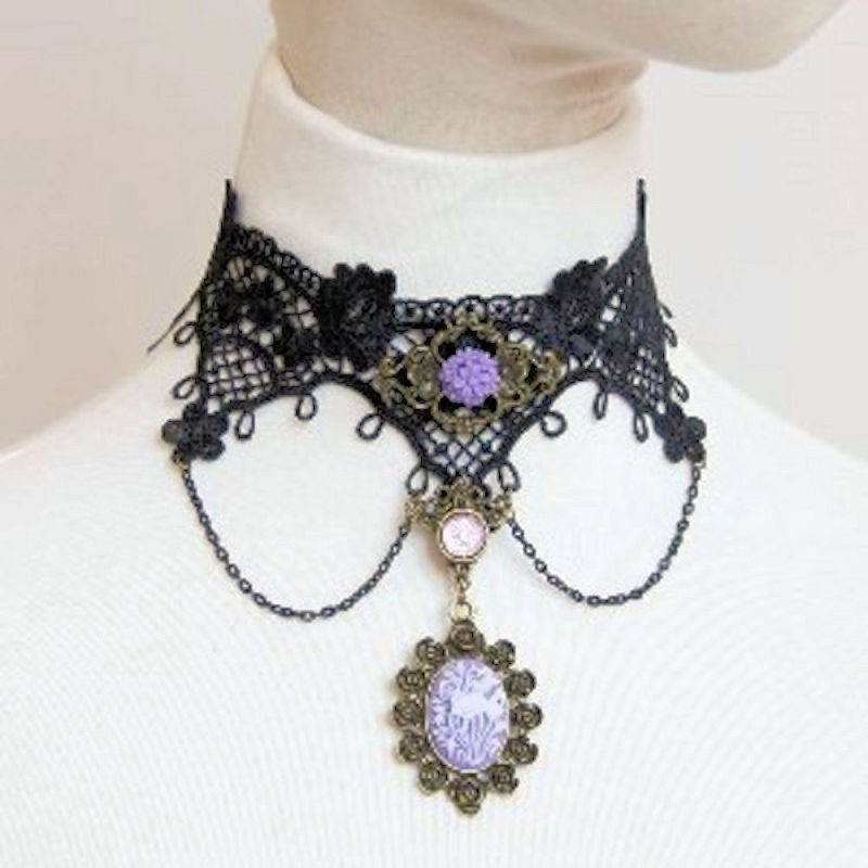 Purple is the color of royalty and you will feel like a royal princess when you are wearing this gorgeous Royal Majesty Cameo choker necklace. An antique gold color filigree jewel is featured at the center with a gorgeous purple flower charm. Beneath this is a shimmering purple pendant that will glitter and glow when kissed by light. Dangling from the crystal charm is a floral cameo pendant. The outer circle of rose blooms perfectly frame an ivory design of blooming roses with a purple background. Black chains also add glorious elegance to this delightful Victorian style choker necklace.