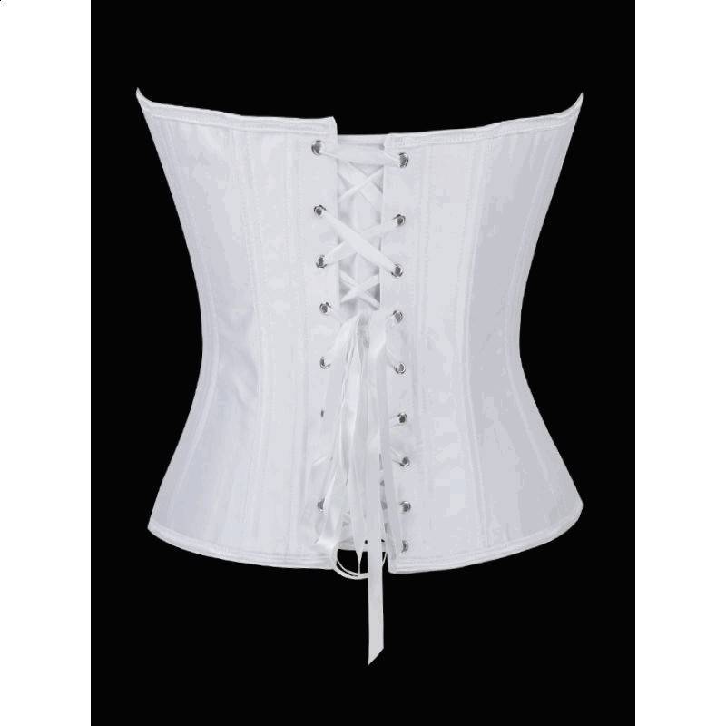 Our elegant Engagement Attire Corset features heavy white satin fabric with black filigree designs down the front, front busk closures, a lace up back with modesty panel and includes a matching thong.