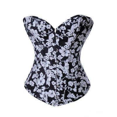 This heavy denim Hawaiian Holiday Corset features black heavy denim fabric covered in white floral designs. Our over bust black corset also has front busk closures, a lace up back with modesty panel and includes a matching thong.