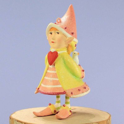 Our Cupid Heart Elf wears a pink dress with white stripes and a red edge hemline. A yellow coat is worn over the dress and features a pink stripe with red polka dots around the cuffs of the sleeves and the hemline. There is white trim on the edge of the coat and at his throat where a pearl button holds the coat closed, just above the red heart. A pink pointed hat is on his head with more red polka dot trim and a white brim. Green & white stripe stockings keep his legs warm and he wears pink pointed toe slippers on his feet with yellow trim and more red polka dots. Cupid Heart Elf holds a white bird behind his back and includes a gift box.