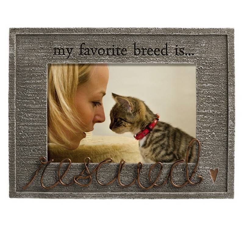 Honor the pet you rescued, or the one that rescued you, with this delightful pet photo frame. Made of resin, the frame looks like it is made of old barn wood. At the top, over the photo, it says, my favorite breed is