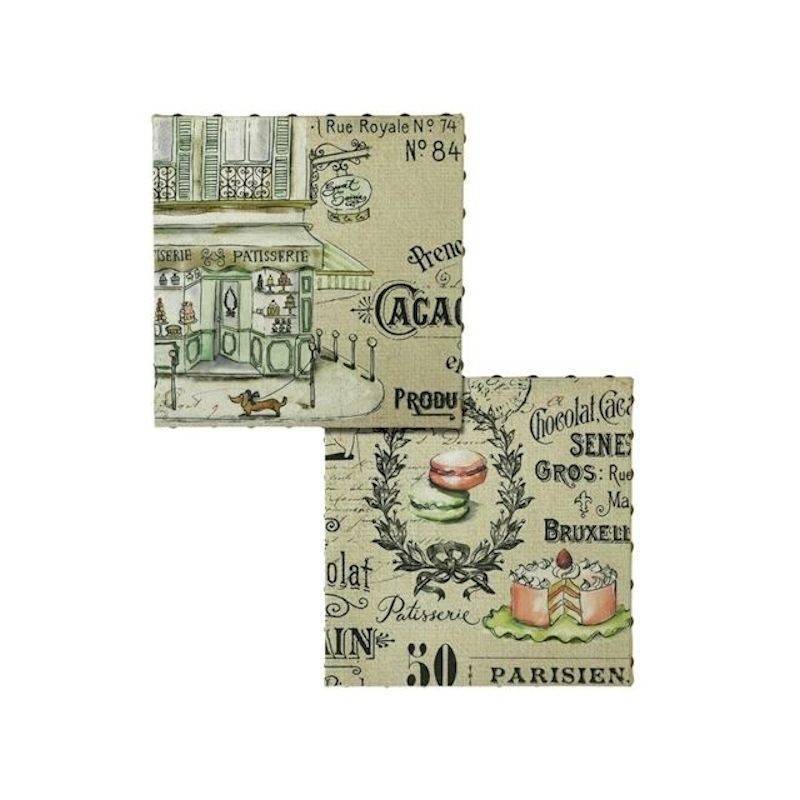 Perfect for your French country home decor, our set of 2 canvas wall art pictures are from our Grasslands Road French Patisserie collection. These fabulous Parisian style fantasy art canvases feature French writing, delightful drawings, dessert pictures and are edged in metal stud trim. If you look closely at the top picture, you will see the cutest small French dachshund dog.