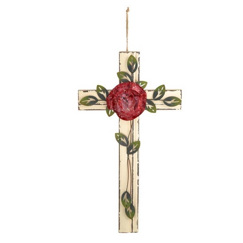 Our gorgeously beautiful, large antique style ivory Red Rose Cross wall art is made of metal and features charming green leaf trim and an awesome red rose with glittering accents at its center.