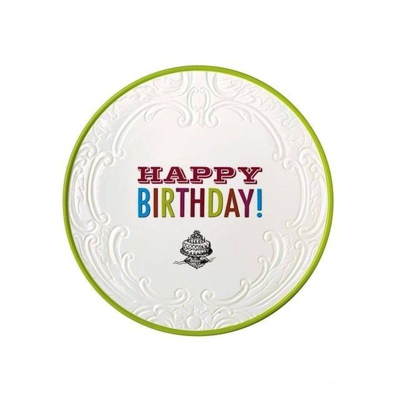 Our spectacularly charming Happy Birthday cake plate is a pedestal stand the will make an awesome centerpiece for your birthday party decor. This ceramic pedestal cake plate is white with icing style raised ceramic trim, a colorful green edge, the word Happy