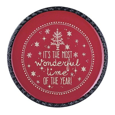 Featuring a black raised edge border, the bright red plate has white filigree snowflake designs and a picture of a Christmas tree at the center and says, It's the most wonderful time of the year