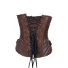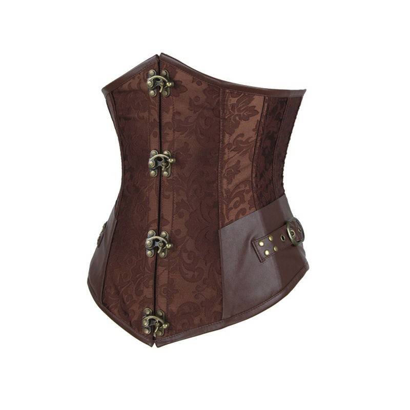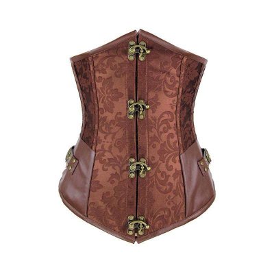 This amazing Queen of Steam Punk steel boned under bust corset is brown and features antique gold color hinges down the front, brown leather trim with buckles at the hips, heavy shoestring laces with modesty panel at the lace up back and includes a matching thong.