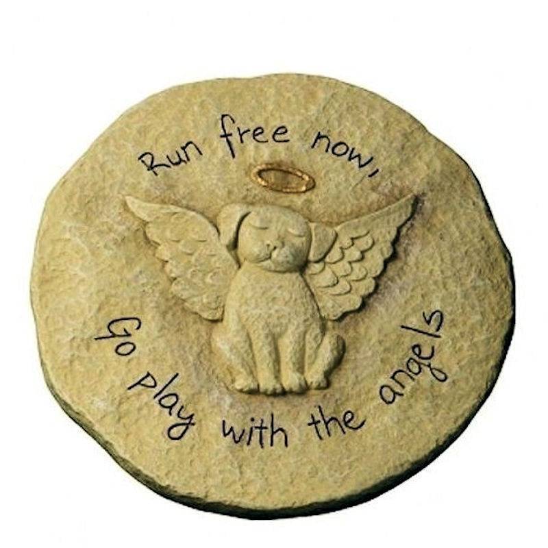 Losing your beloved dog can be such a tragic and heart breaking experience. We offer this dog angel figurine stepping stone or garden sign as a pet memorial. It features a puppy with angel wings and a gold halo that says, Run free now, go play with the angels.