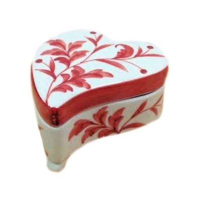 This gorgeously beautiful ceramic Heart Shape Red Leaf Design Trinket Box is from Andrea by Sadek. The red leaf design trinket box measures 3 inches long and includes its own gift box.