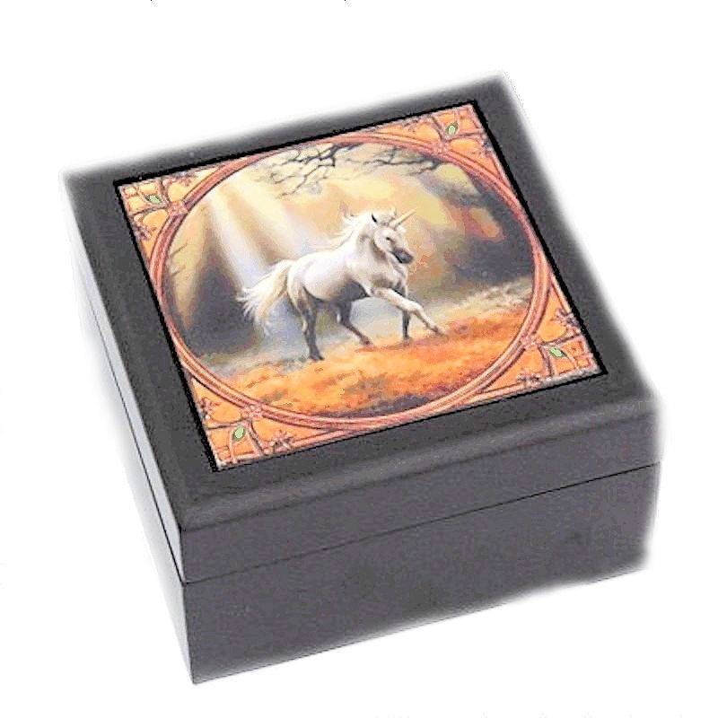 Unicorns are awesome magical creatures and this one, by artist Anne Stokes, looks fabulous on our gorgeous fantasy art unicorn jewelry box. A handsomely stunning white unicorn runs through a field of gold. This unicorn art has been produced on a ceramic tile and inlaid in the top of the felt lined wood box.