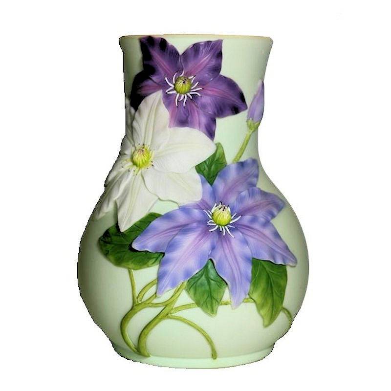 Our uniquely gorgeous 8 inch tall sculpted flower vase is ceramic and features lovely Clematis flowers in white and purple colors against an ivory background.