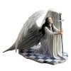 This awesome fantasy art Gothic style angel figurine, Grieving on a Grave by Veronese Design, features a beautiful angel with feather wings lying across a gravestone holding a red rose in her hand. She is wearing a black dress that has been shredded because of her unbearable grief. She must have lost her one true love that lies beneath the grave stone.
